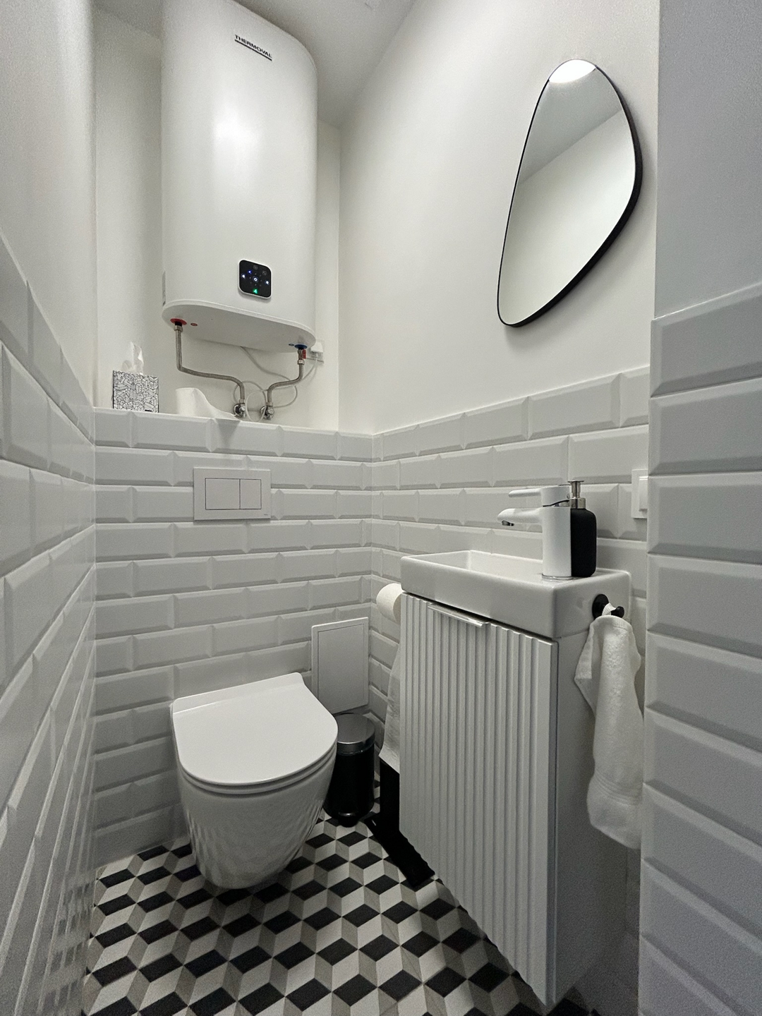 Dwie niezależne łazienki to podwójna wygoda i większa swoboda przy większej liczbie gości. Jedna z prysznicem, druga z toaletą i umywalką – obie w eleganckim, minimalistycznym stylu, z zestawem kosmetyków i kompletem ręczników.
