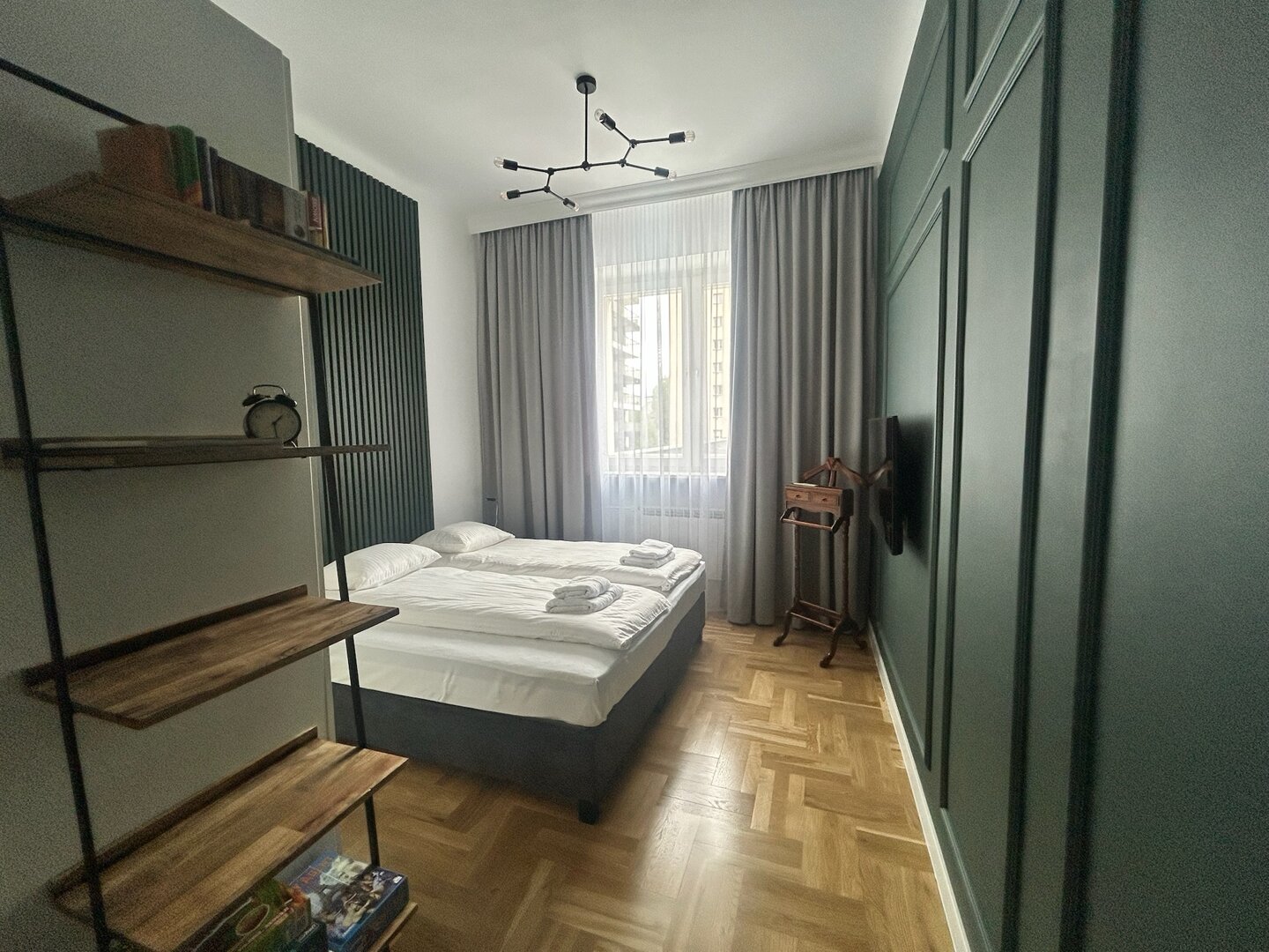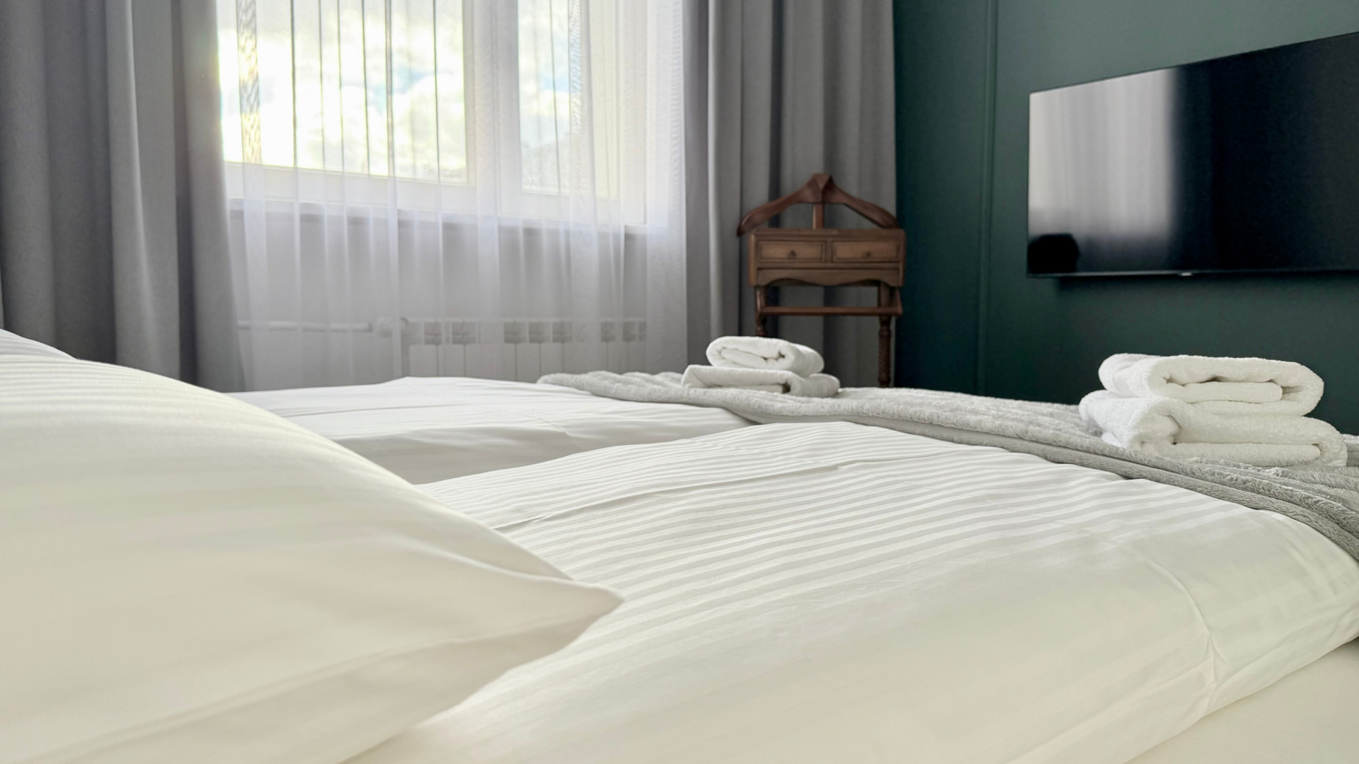 Sypialnia została zaprojektowana jako przestrzeń sprzyjająca wypoczynkowi i regeneracji. Wygodne łóżko kontynentalne z możliwością rozdzielenia na dwa osobne, wysokiej jakości pościel i zaciemniające zasłony zapewniają komfortowy sen.